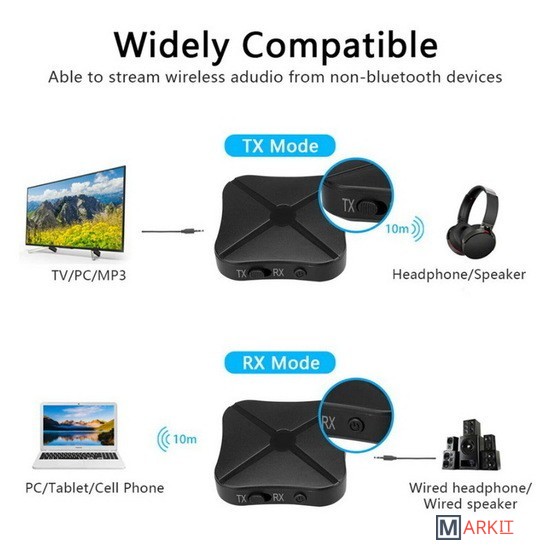 Портативный и легкий беспроводной аудио передатчик и приемник – идеальное решение для широкого спектра задач. Совместим со многими устройствами, например, компьютер, ноутбук, домашний кинотеатр, наушники, смартфон, mp3-плеер, CD-плеер и т.п.Режим передатчика (TX – красный диод): обеспечивает беспроводную передачу аудио с телевизора без Bluetooth, домашнего кинотеатра или CD-плеера на Bluetooth наушники или колонки.Режим приемника (RX – синий диод): обеспечивает беспроводную передачу аудио с телефона, планшета или компьютера с поддержкой Bluetooth на проводные колонки или наушники.Для переключения между режимами передатчика и приемника используется переключатель TX/RX. Прост в подключении: по технологии Bluetooth и кабелю jack 3.5mm. Имеет встроенный аккумулятор и заряжается от порта USB.Характеристики:- рабочий диапазон: до 10 м (без каких-либо блокирующих объектов);- время зарядки: 2 часа;- время непрерывного использования: 6 часов (режим приемника) / 5 часов (режим передатчика);- тип батареи: литий-полимерный (200 мАч);Комплектация:- беспроводной аудио адаптер Bluetooth v4.2 RX/TX – 1шт;- кабель питания MicroUSB – 1шт;- RCA кабель – 1шт;- кабель jack 3.5mm (AUX);- руководство пользователя.