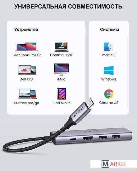 HDMI2.0, поддержка HDCP2.2, HDR10/3DHDMI разрешение до 4K@60Hz USB-C PD Power до 100 Вт