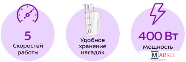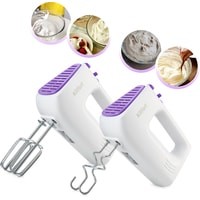 Класс защиты от поражения электрическим током: II;Материал корпуса: пластик;Материал насадок: хромированная сталь;Размеры: 195x95x145 мм;Вес: 0.8 кг.Комплектация:- миксер;- 2 венчика для взбивания;- 2 крюка для замеса;- держатель насадок;- руководство по эксплуатации.